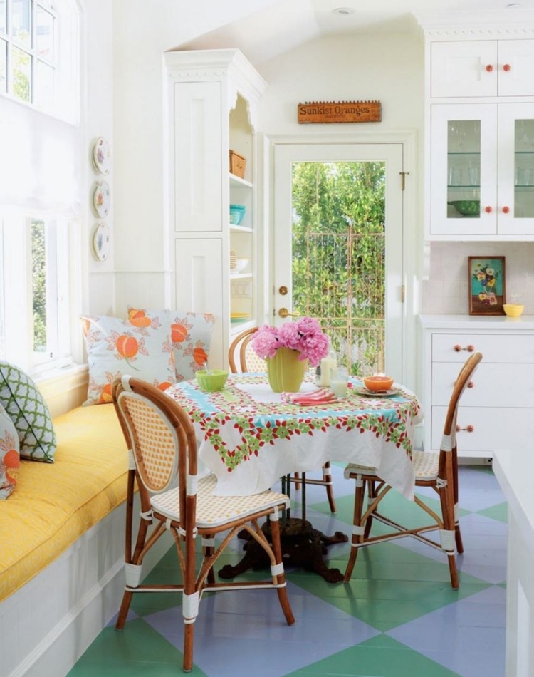 Даже если вы не ждете гостей и не собираетесь обедать, не оставляйте стол в кухне пустым. Пусть на нем будут сервированные салфетки и вазы с цветами, фруктовницы, вазочки с печеньем или конфетами — это сделает вашу кухню уютной.