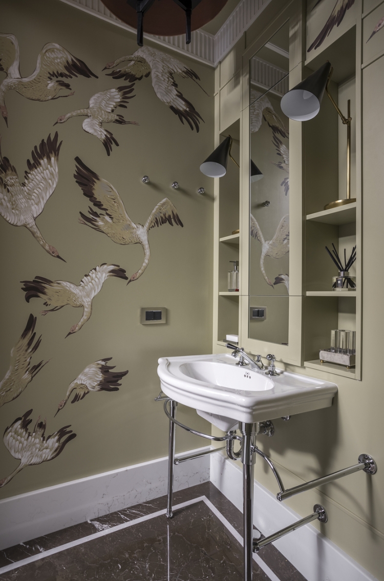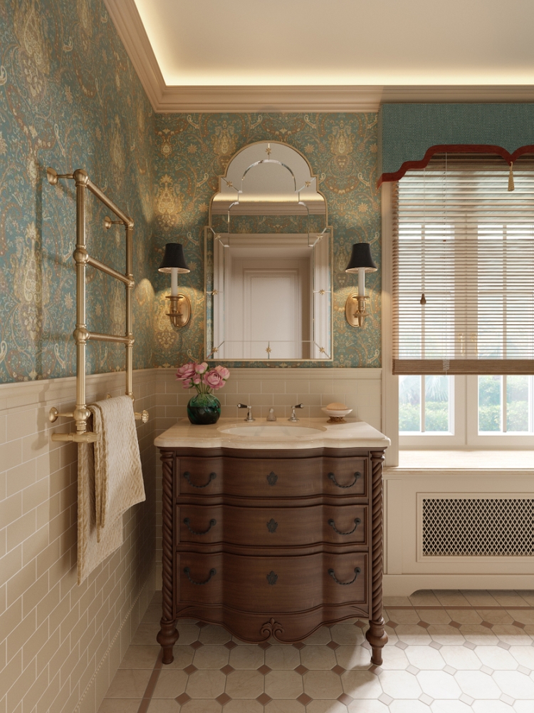 - Поклеить в сухих зонах обои или отделать стены плиткой под «жилой» обойный принт.