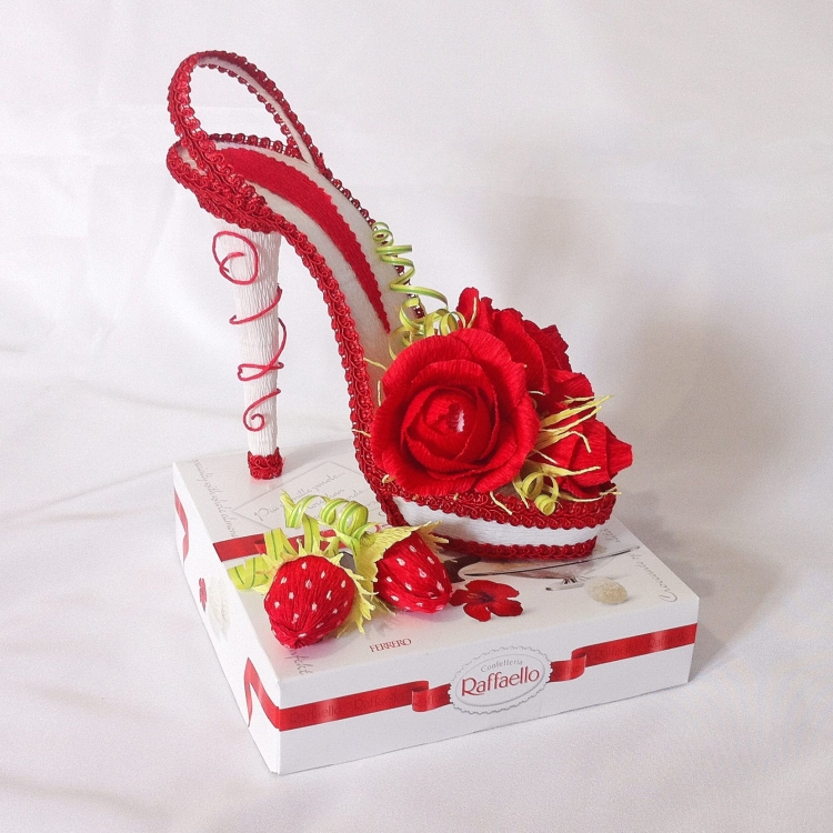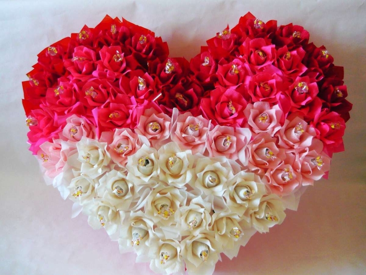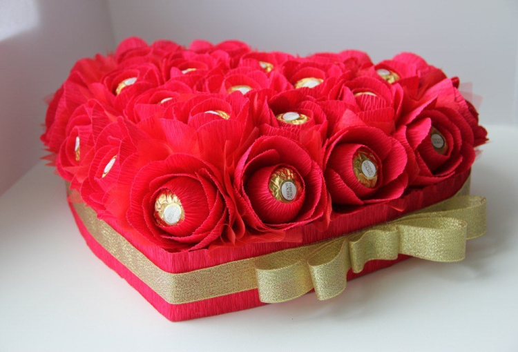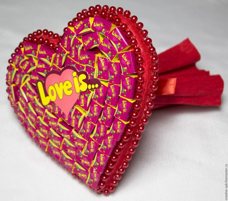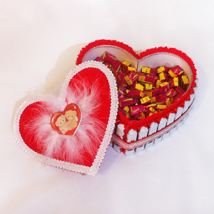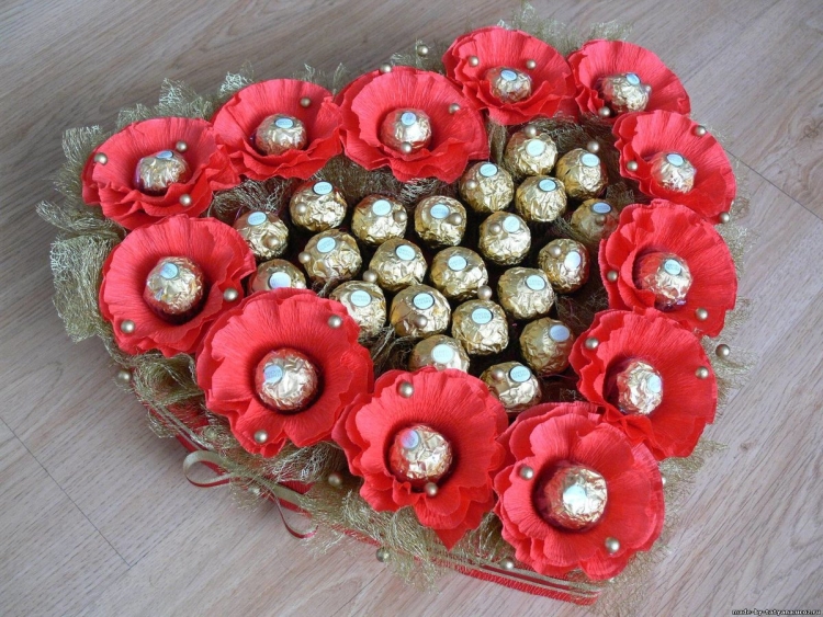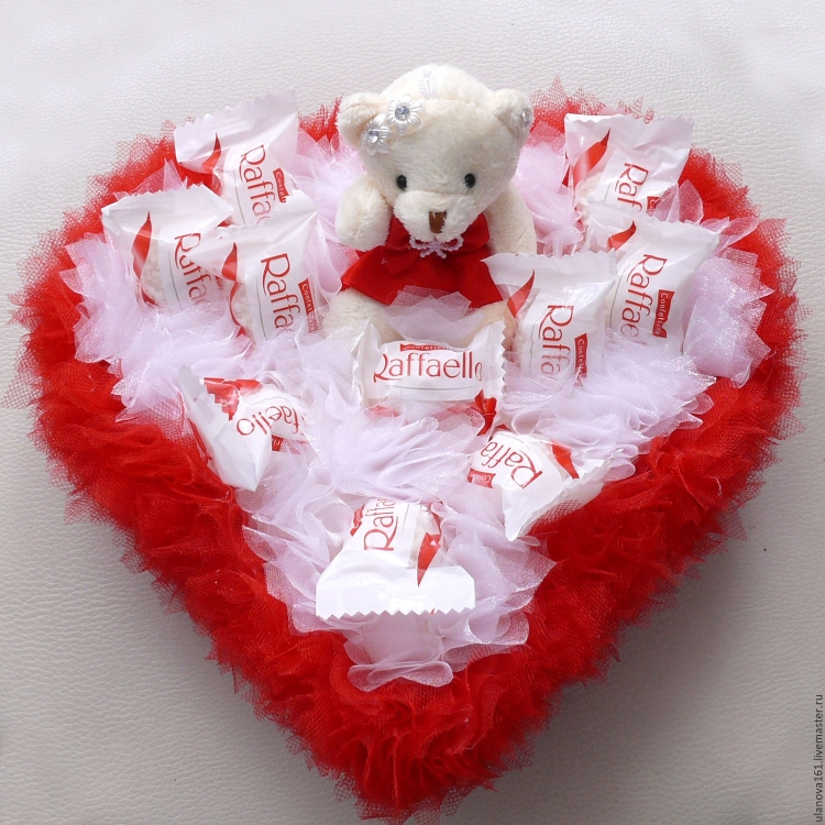 Прекрасный вариант для молодой пары. Если вы хотите сделать подарок в День всех влюбленных, вам может подойти такой вариант. Делаем основание в виде сердца (можно использовать плотный картон). Далее красиво раскладываем конфеты внутри, лицевую часть формы оборачиваем красной бумагой или украшаем другим способом, дополняем ленточкой.