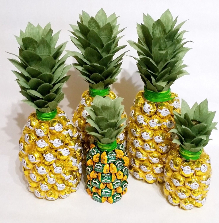 Благодаря вытянутой круглой форме бутылки, из нее может получиться оригинальный «букет» ананас.