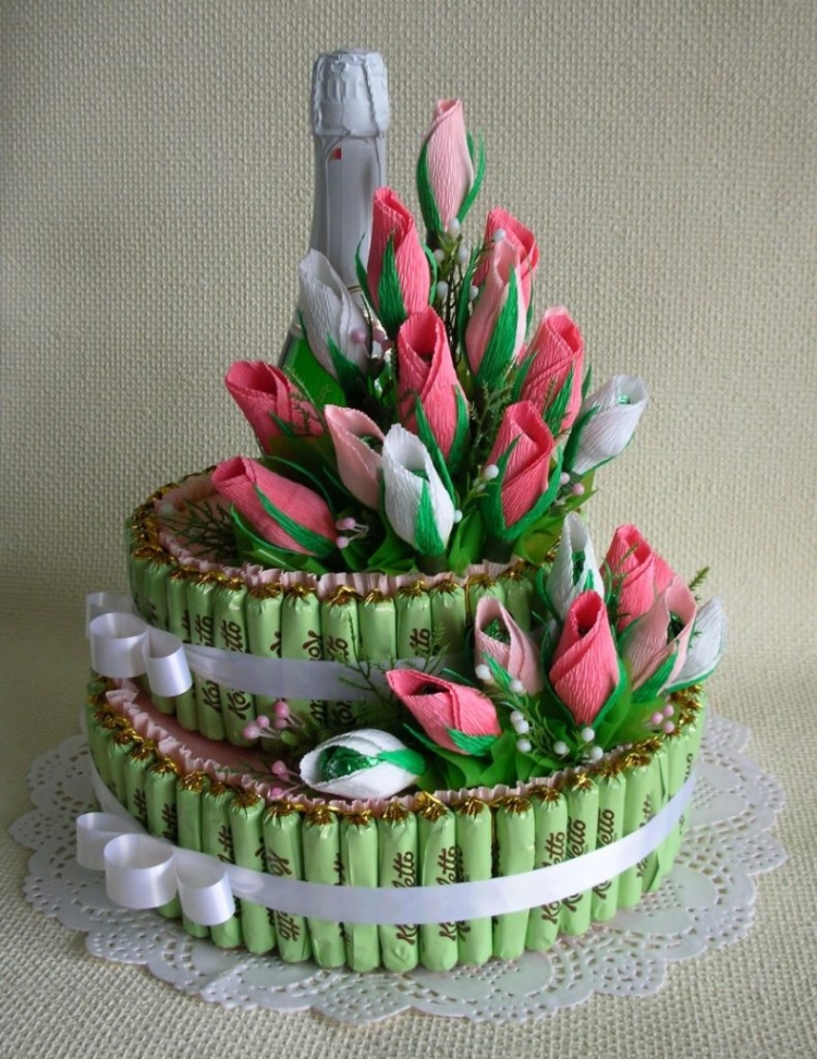 - если вы решили наполнить торт сладостями изнутри, то внешнюю сторону можно украсить тканью, искусственными цветами, покупными украшениями или сделанными своими руками.