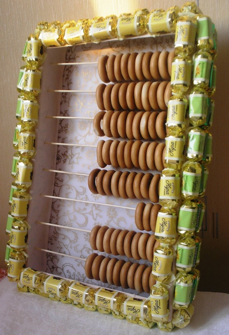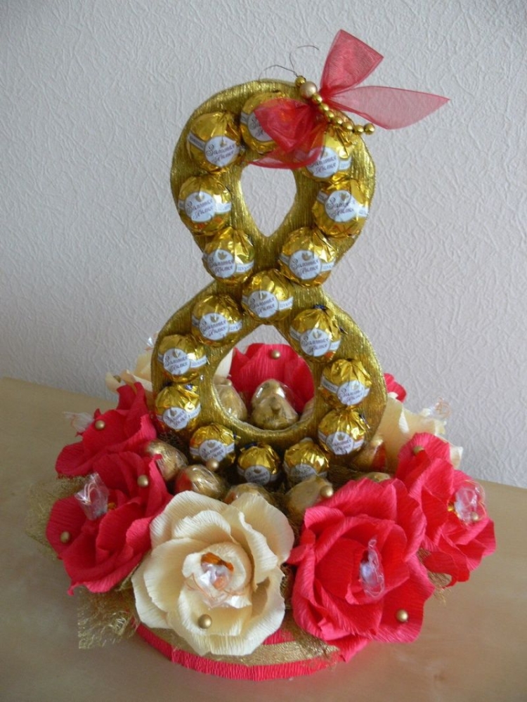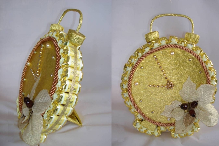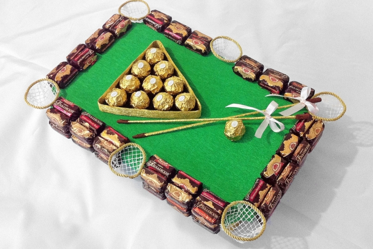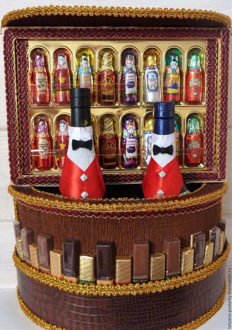 Вариантов изготовления таких подарков очень много. Если же у вас нет времени делать подарок самому, можно приобрести готовые сладкие наборы в магазинах или у мастеров, которые занимаются изготовлением сладких презентов на заказ.