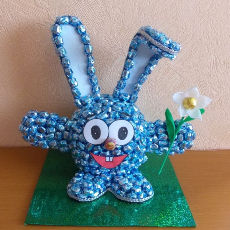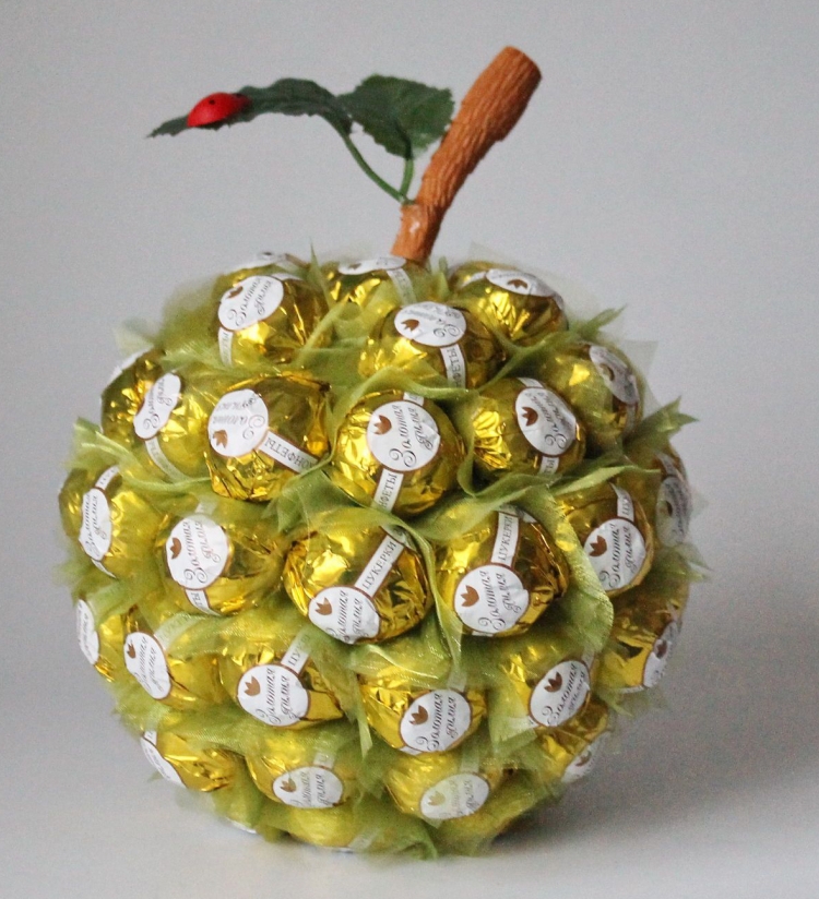 Круглая композиция. Изобразить можно планету или футбольный мяч, любой предмет круглой формы в зависимости от интересов ребенка, которому предназначается поделка. Чтобы сделать круглый сладкий набор, достаточно взять поролоновую заготовку и оформить ее конфетами, используя обычные зубочистки.