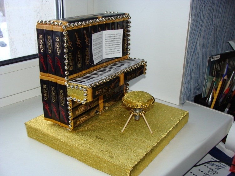 Если человек интересуется музыкой, можно смастерить любой инструмент, используя конфеты, в реальном размере или уменьшенную версию.