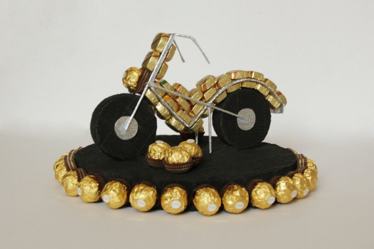 Если вы задумали сделать приятный подарок для взрослого человека, то конфетами можно украсить букеты или шампанское, использовать сладости для создания креативных поделок в форме предметов, которые человек любит или хотел бы получить.